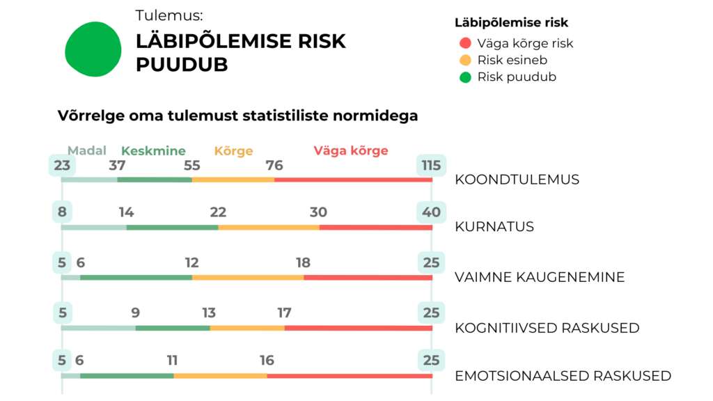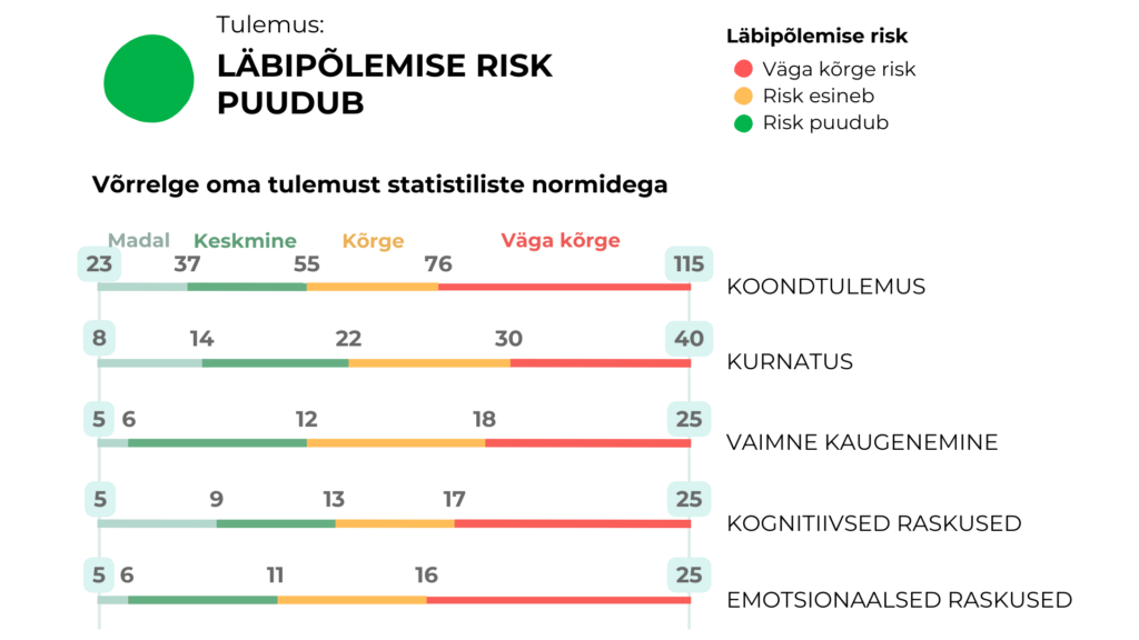 Statistilise analüüsil kaudu leitud piirväärtuste abil on võimalik võrrelda Sinu tulemusi patsientidega, kes kannatavad tõsiste läbipõlemise vaevuste all. Võrdlus näitab, kas ja kuivõrd on Sinu tulemus piirväärtustega võrreldes problemaatiline.
