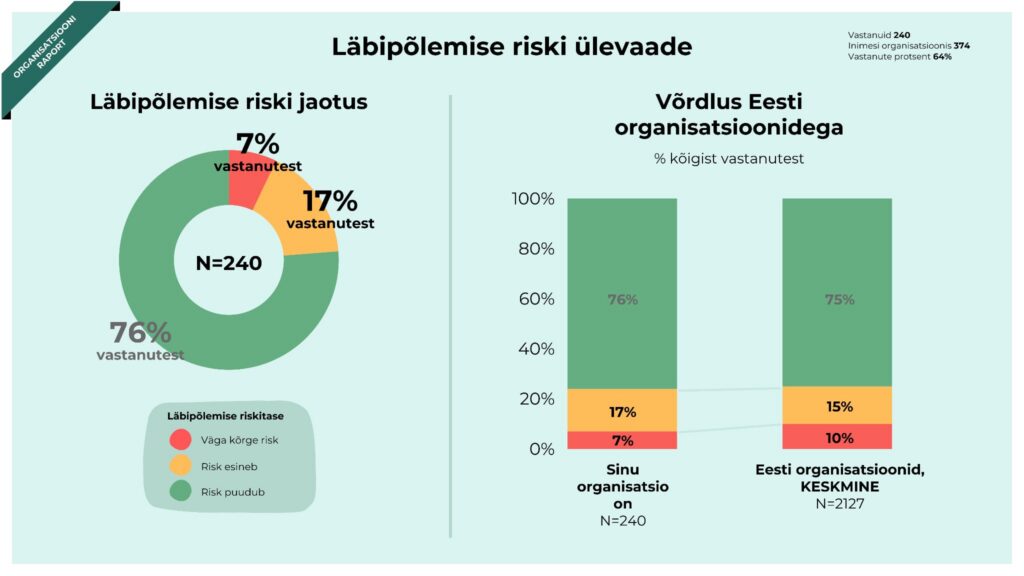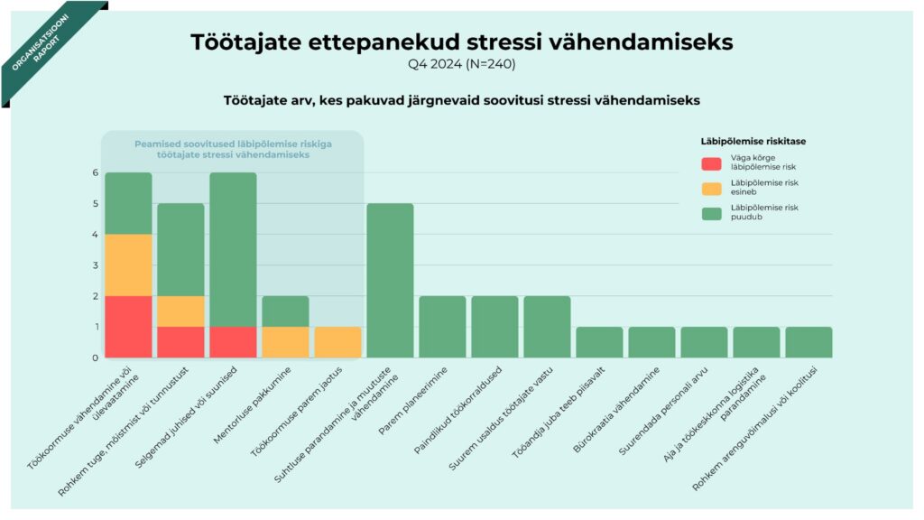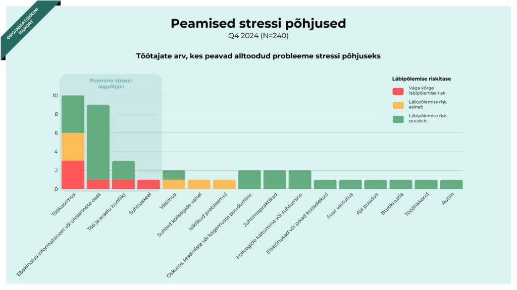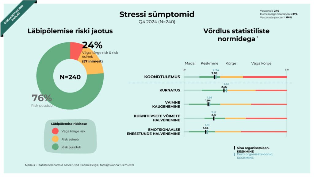 Juhtivtöötajana saad teada oma töötajate stressi seisust, läbipõlemise riskist, stressi sümptomitest, stressi põhjustest ning töötajate ettepanekutest stressi vähendamiseks. Seda kõike nt erinevate osakondade, ametikohtade lõikes. Neid tulemusi näitame Sulle võrdluses Sinu enda organisatsiooni, kui ka teiste Eesti organisatsioonide keskmisega. Tulemused saad visuaalse ja selgesti mõistetava raporti näol, mida on lihtne tegevuste algatamiseks kasutada.